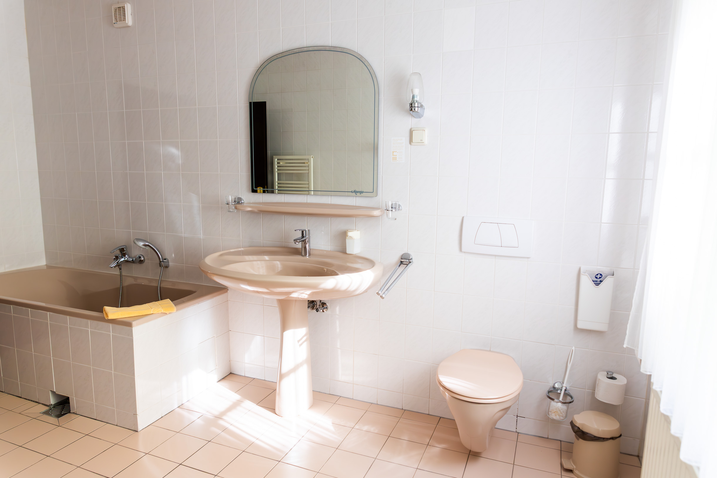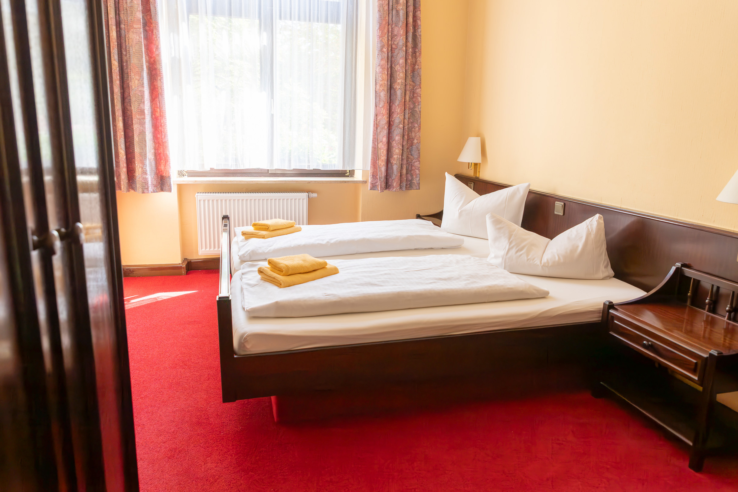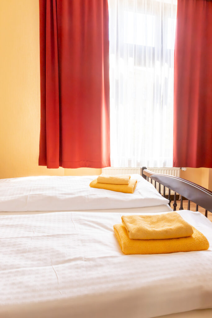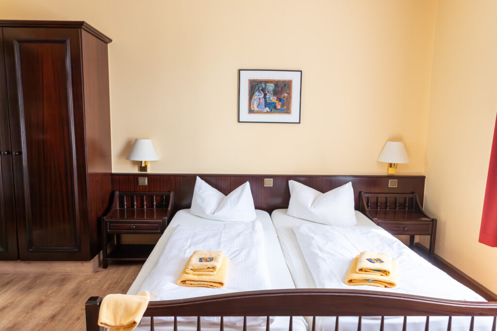 Die Zimmer für zwei Personen sind mit Doppelbett, Bad oder Dusche, WC, Fernseher, Telefon und WLAN ausgestattet.